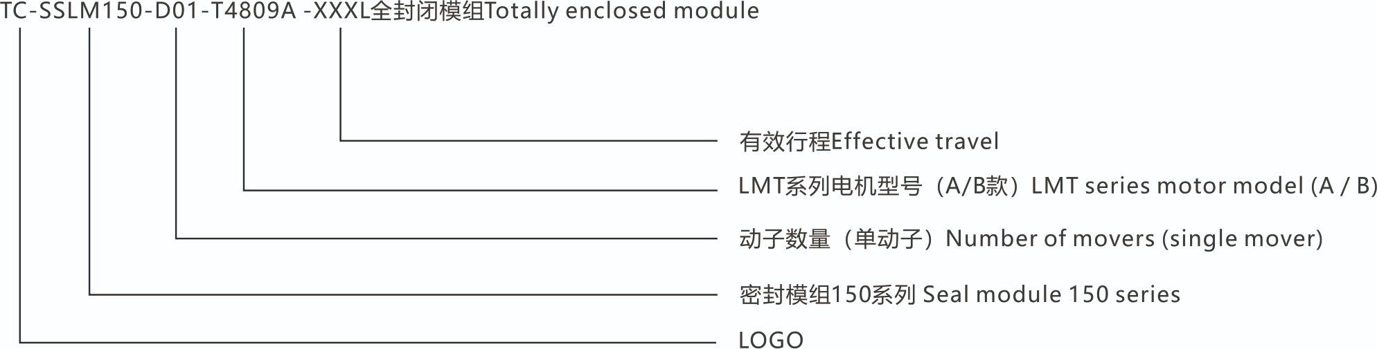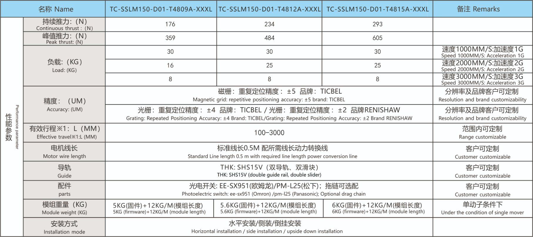 While specific technical parameters for the TC-SSLM150 are not detailed in the provided excerpts, the broader TC-SLM series is known for offering a wide range of continuous thrust (from 60N upwards) and supports very long travel distances, even up to 30 meters through modular splicing.