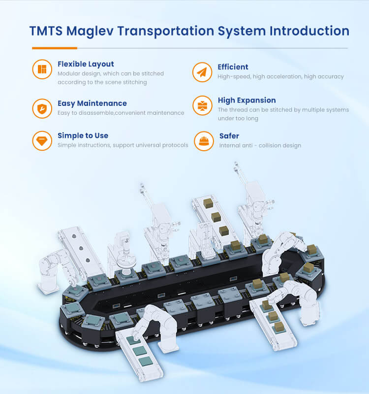 The TMTS (Maglev Transportation System) is a modular magnetic levitation transport solution designed for industrial automation. It operates similarly to a linear motor, using controlled stator modules to drive movers equipped with permanent magnets for precise cargo handling.